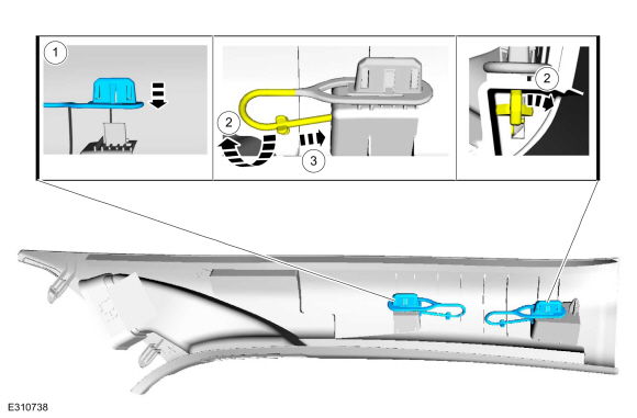 Установите зажим панели отделки передней стойки из зажимов страховочного троса.