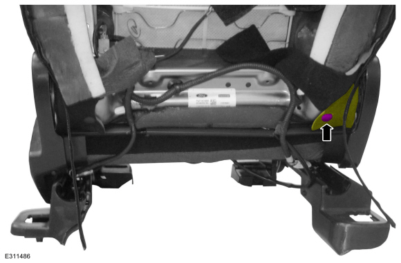 Отсоедините фиксатор жгута проводов коврика обогрева спинки переднего сиденья и отложите его в сторону.