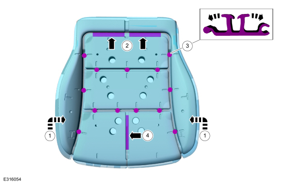 Отсоедините подложку подушки заднего сиденья от фиксаторов каркаса заднего сиденья в указанном порядке.