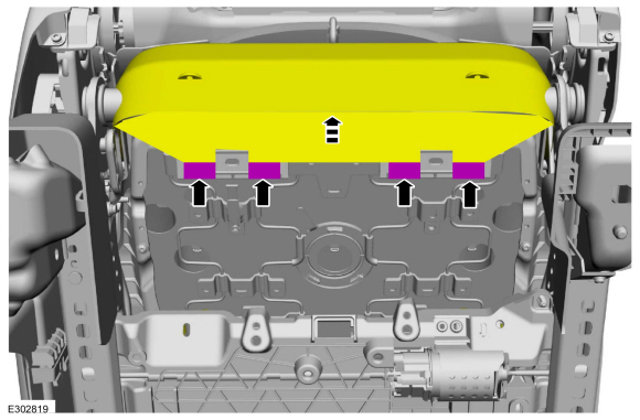 Отсоедините фиксаторы обивки подушки заднего сиденья от основания подушки заднего сиденья.