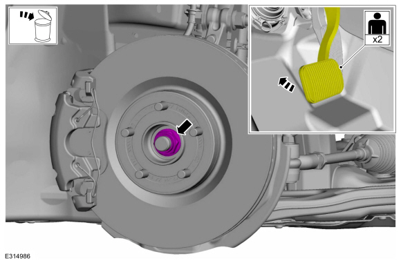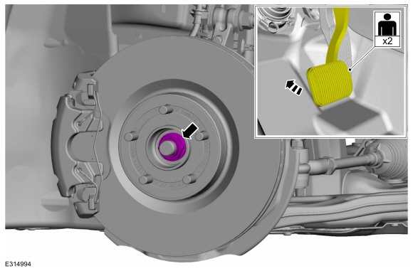 УВЕДОМЛЕНИЕ: Не затягивайте гайку ступицы переднего колеса автомобиль на земле. Гайка должна быть затянута в соответствии со спецификацией перед автомобиль опускается на колеса. Произойдет повреждение ступичного подшипника если ступичный подшипник нагружается весом автомобиля.