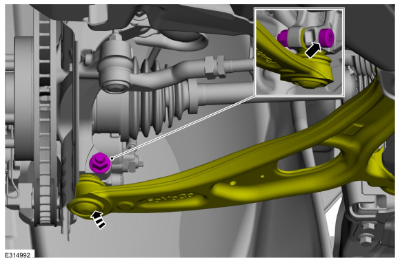 УВЕДОМЛЕНИЕ: Не используйте электроинструменты для снятия или установки гайка наружной части нижнего рычага. Повреждение шарового шарнира или уплотнения шарового шарнира может происходить.