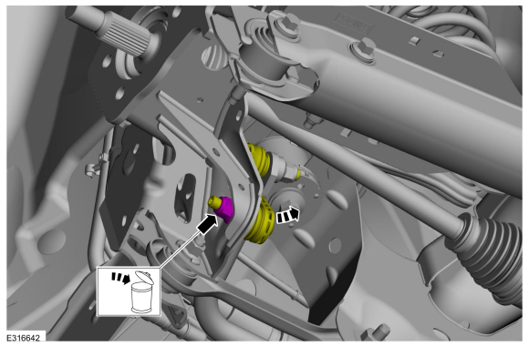 УВЕДОМЛЕНИЕ: Не используйте электроинструменты для снятия стабилизатора поперечной устойчивости. соединительная гайка. Повреждение шарового шарнира тяги стабилизатора поперечной устойчивости или пыльника может происходить.