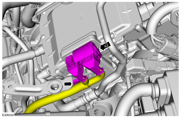 Отсоедините электрический разъем насоса охлаждающей жидкости и снимите фиксаторы жгута проводов.