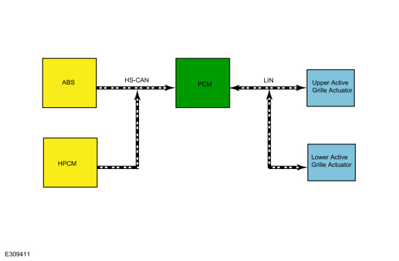 PCM связывается с активным приводом(ами) заслонки решетки радиатора через LIN. LIN поддерживает двунаправленную связь между активным(и) приводом(ами) жалюзи решетки радиатора и PCM, позволяя активному(ым) приводу(ам) жалюзи решетки передавать информацию о положении и неисправности в PCM.