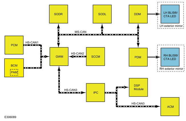 Когда система BLIS® или CTA активна и объект обнаружен SODL или SODR, система BLIS®/CTA Командное сообщение светодиода отправляется от SODL или SODR к DDM или PDM. Напряжение питания и масса DDM и PDM для освещения соответствующих наружных зеркал BLIS®/CTA Светодиод на основе сообщений, полученных от SODL и SODR.