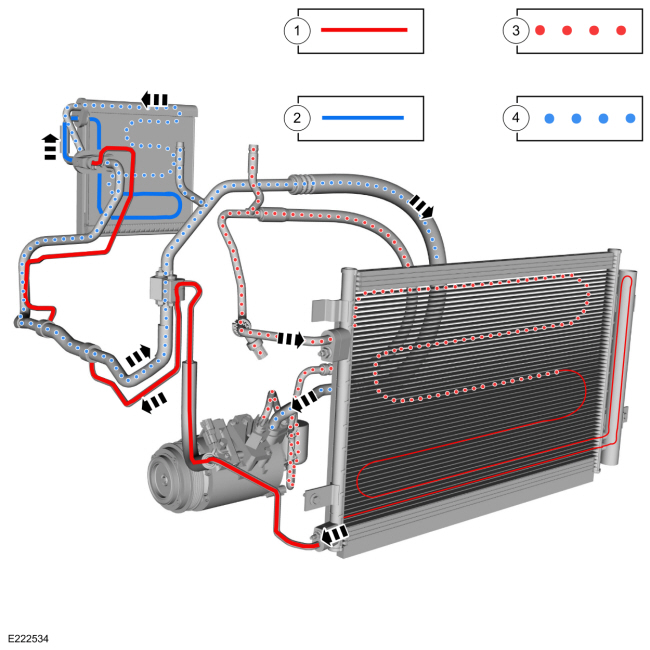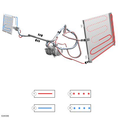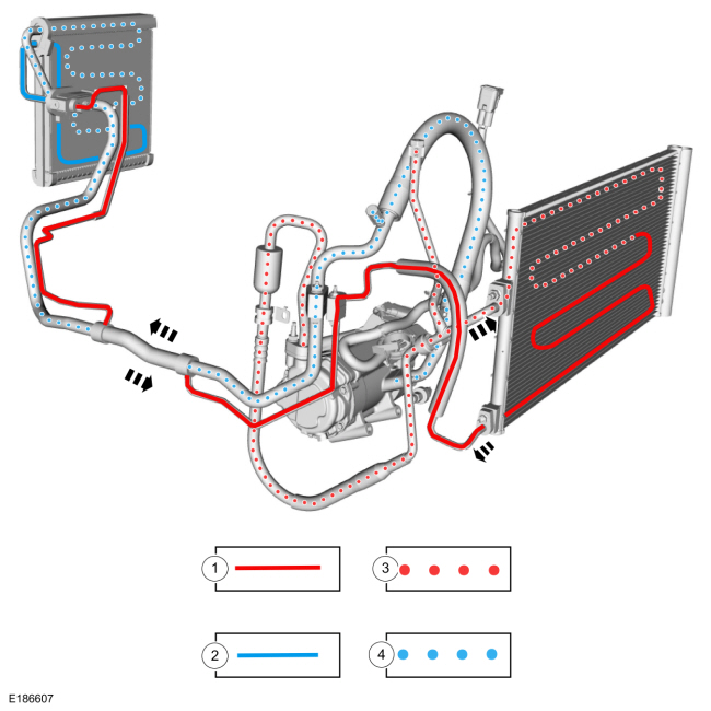 Для получения информации о базовом HVAC работу системы с хладагентом, см. текущий веб-сайт Ford. Курсы технического обучения. На следующей диаграмме показан хладагент состояние системы в каждом компоненте.