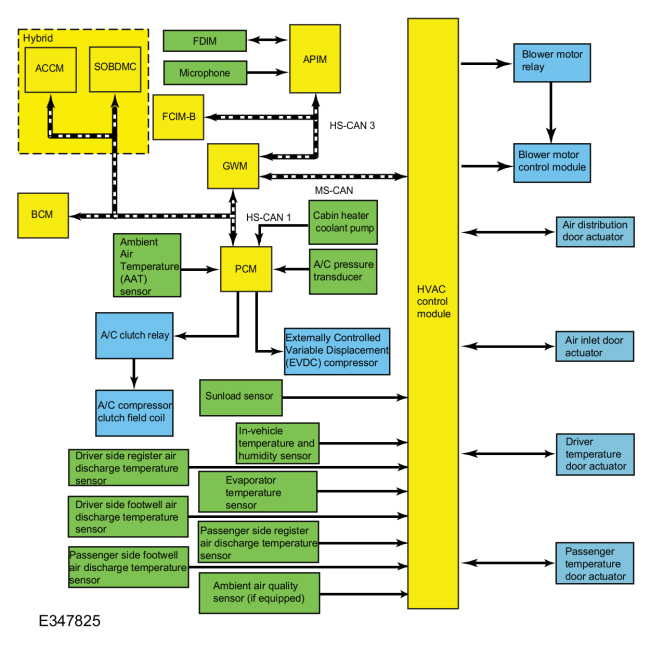 При использовании сенсорного экрана FDIM или голосовых команд и выборе A/C APIM отправляет сообщение запроса по HS-CAN3 на GWM. Когда клиент вводит запрос A/C в модуль управления передним интерфейсом управления B (FCIM-B), модуль отправляет запрос в GWM по HS-CAN3. Как только запрос A/C выбран из любого интерфейса, GWM отправляет запрос в SOBDMC через HS-CAN1. SOBDMC управляет электрическим компрессором. GWM также отправляет запрос в модуль управления HVAC через MS-CAN.