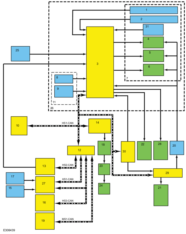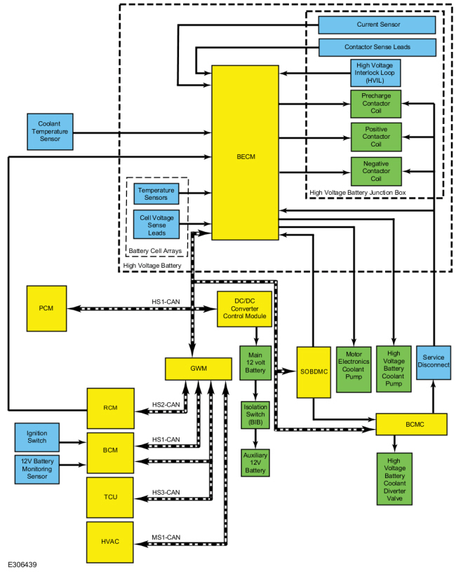 BECM отслеживает напряжение отдельных элементов и датчики температуры внутри массивов батарей. БЭКМ контролирует ток батареи с помощью датчика, расположенного в высоковольтной распределительная коробка аккумулятора. Эта информация необходима BECM для управления высоковольтной батареей и определения ее способности получать и подавать питание на транспортное средство. BECM связывается с другими модулями автомобиля по шине HS-CAN.