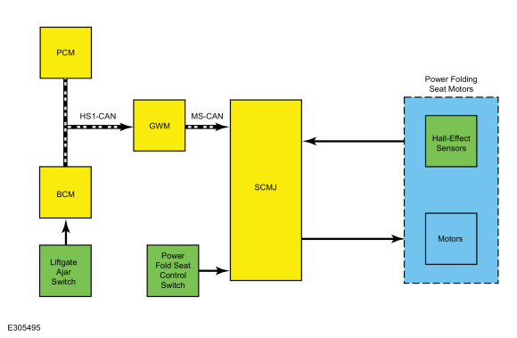 Двигатели складывающихся сидений с электроприводом являются двунаправленными, и каждый из них содержит датчик Холла, используемый SCMJ. контролировать движение двигателя и положение сиденья. Электродвигатели складывания сидений обслуживаются путем установки новой спинки сиденья третьего ряда.