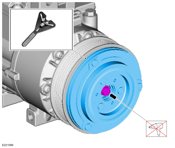 Не используйте пневматические инструменты. Это может привести к повреждению шкива муфты кондиционера или компрессора кондиционера.