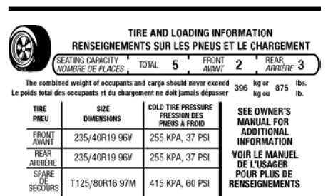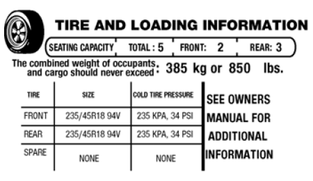 GAWR — это максимально допустимый вес, который может нести одна ось (передняя или задняя). Эти номера указаны на этикетке сертификации соответствия требованиям безопасности. Этикетка расположена на стойке дверной петли, стойке дверной защелки или на кромке двери, соприкасающейся с дверной защелкой столб, рядом с сиденьем водителя.