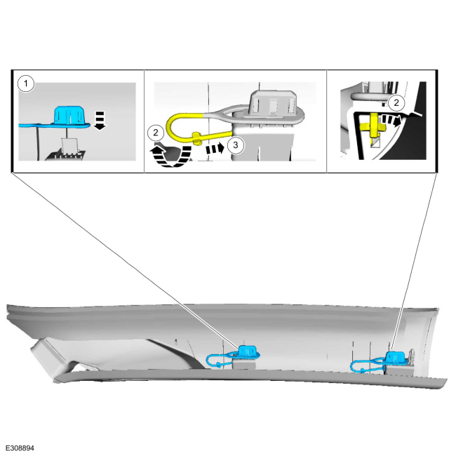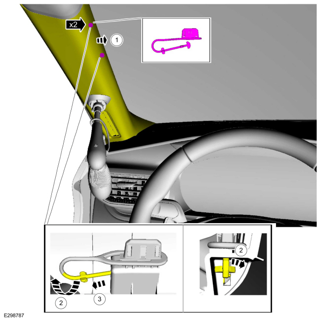 Установите зажим панели отделки передней стойки из зажимов страховочного троса.