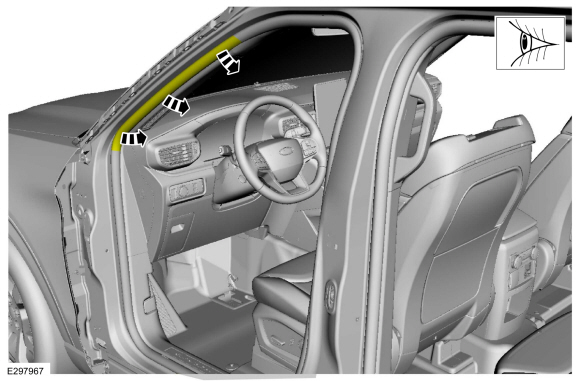 Осмотрите и расположите кромку уплотнительной планки передней двери так, чтобы она перекрывала верхнюю часть панели отделки передней стойки.