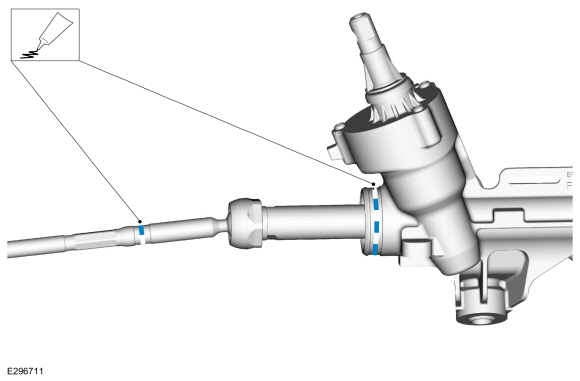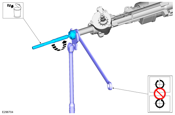 УВЕДОМЛЕНИЕ: Установите рулевой механизм в центральное положение и удерживайте рулевую рейку, затягивая рулевую тягу. Используйте гаечный ключ соответствующего размера на плоской поверхности/зубцах стойки, чтобы противостоять вращение и предотвратить повреждение во время установки рулевой тяги.