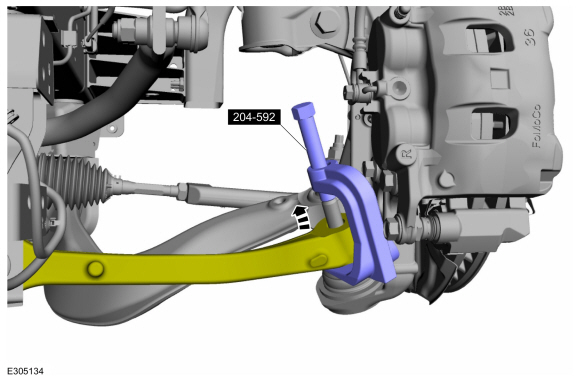 УВЕДОМЛЕНИЕ: Не используйте молоток, рычажное устройство или сепаратор. вилка для отделения шарового шарнира от поворотного кулака. Повреждение может возникнуть шаровой шарнир или уплотнение шарового шарнира.