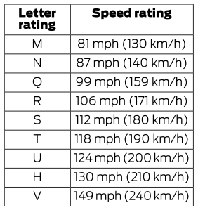 Г. ЧАС: Указывает индекс скорости шины. Рейтинг скорости обозначает скорость, при которой шина рассчитана на длительную эксплуатацию в условиях стандартные условия нагрузки и давления накачки. Шины на вашем автомобиле могут работают в разных условиях по нагрузке и давлению накачки. Эти рейтинги скорости может потребоваться корректировка с учетом разницы в условиях. Рейтинги варьируются от от 81 мили в час (130 км/ч) до 186 миль в час (299 км/ч). Эти рейтинги перечислены в следующем диаграмма.