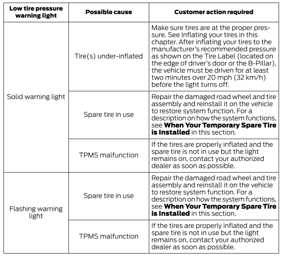 Основная функция системы контроля давления в шинах — предупредить вас, когда вашим шинам нужен воздух. Он также может предупредить вас, если система больше не способна функционирования по назначению. См. следующую таблицу для получения информации о вашем система контроля давления в шинах: