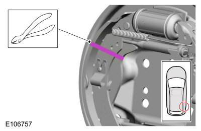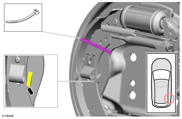 Установите кабельную стяжку на правую заднюю тормозную колодку и рычаг стояночного тормоза.