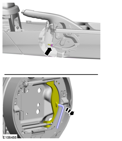 Установите шестигранный ключ на 2 мм между опорой левого рычага стояночного тормоза и тормозной колодкой.