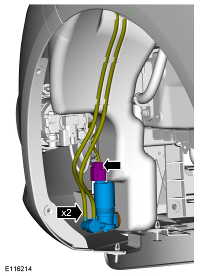 Отсоедините электрический разъем насоса омывателя и снимите насос омывателя ветрового стекла.