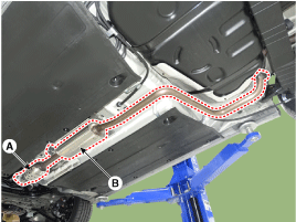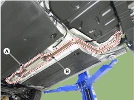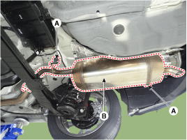Снимите каталитический нейтрализатор и центральный глушитель (B).