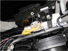 Подсоедините разъем жгута проводов подушки безопасности пассажира к разъему основного жгута проводов системы SRS (А).