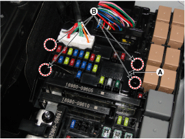 Нажмите на четыре крючка (B) в направлении стрелки и поднимите блок печатной платы (A).