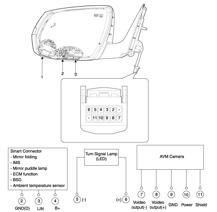 Hyundai Genesis (DH) 2013-2016 Руководство по ремонту / Электрическая система кузова / Система обнаружения слепых зон / Компоненты индикатора обнаружения слепых зон и расположение компонентов