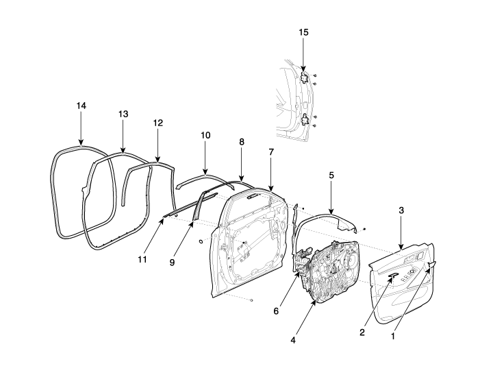 10. Верхний открытый уплотнитель передней двери 11. Ремень передней двери снаружи уплотнителя 12. Ветровое стекло передней двери в сборе. 13. Боковой уплотнитель передней двери 14. Боковой уплотнитель кузова передней двери 15. Петля передней двери |