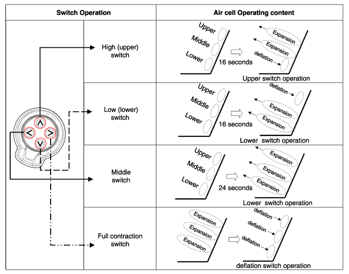 После подачи питания на воздушный насос и напряжения на каждый переключатель проверьте нормальную работу пневмоподдержки поясницы.