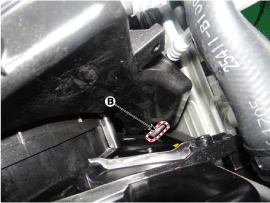 Снимите расширительный бачок (А) после ослабления болтов крепления вентилятора охлаждения. и затем отсоедините шланг перелива (B).