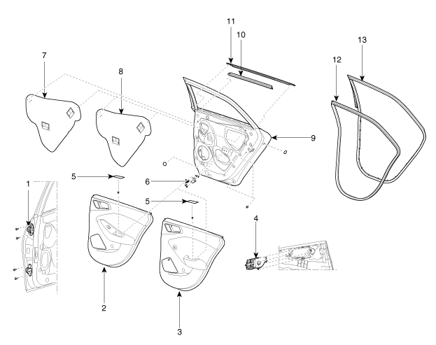 9. Панель задней двери 10. Резиновый внутренний уплотнитель ниши задней двери 11. Наружная резиновая прокладка ниши задней двери. 12. Резина бокового уплотнителя задней двери 13. Резинка бокового уплотнителя задней двери |
