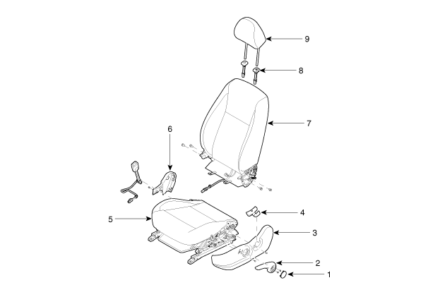 7. Спинка переднего сиденья 8. Направляющая подголовника переднего сиденья 9. Подголовник переднего сиденья |
