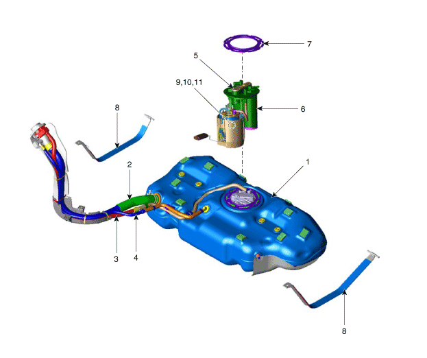 8. Планка топливного бака 9. Насос топливного фильтра 10. Регулятор давления топлива 11. Датчик топлива |
