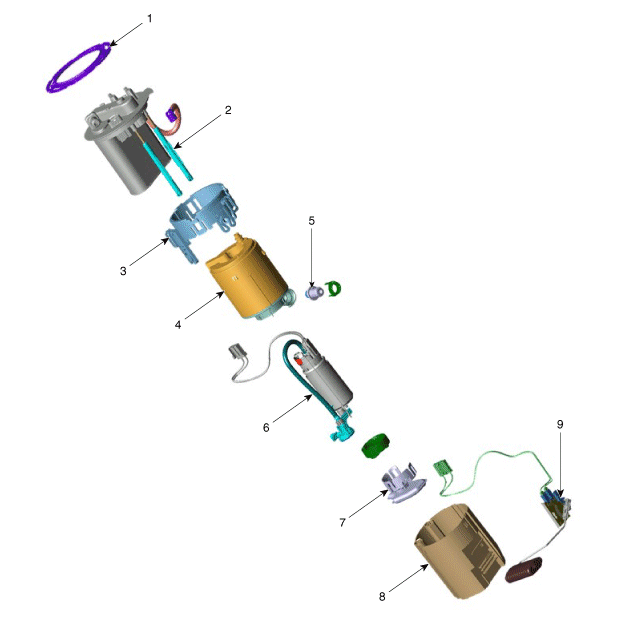 7. Предварительный фильтр 8. Крышка бака 9. Модуль топливного насоса |