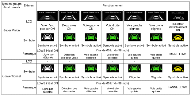 Он работает, когда функция LDWS зафиксирована и превышает 60 км/(38 миль/ч)