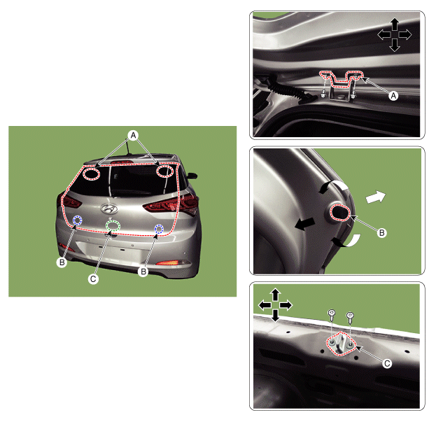 (A), отрегулируйте дверь багажного отделения, перемещая ее вверх, вниз или вправо.