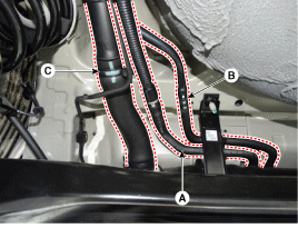 Отсоедините быстроразъемный соединитель (В) от шланга подачи топлива.