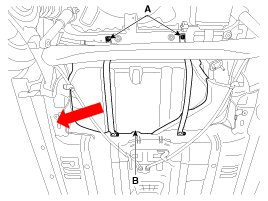 Вытащите топливный бак (В) в направлении, указанном стрелкой.