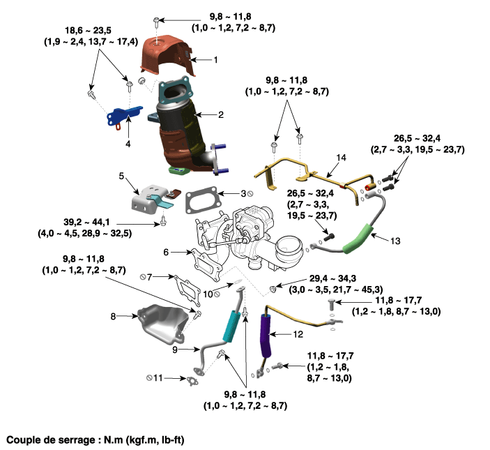 2. Прогрев каталитического нейтрализатора (WCC) 3. Прокладка каталитического нейтрализатора прогрева (WCC) 4. Верхняя стойка каталитического нейтрализатора прогрева (WCC) 5. Верхняя стойка выпускного коллектора 6. Коллектор турбонагнетателя 7. Прокладка коллектора турбонагнетателя |