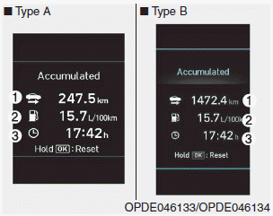Чтобы вручную сбросить информацию, нажмите и удерживайте кнопку OK при просмотре. Накопленная информация о вождении. Расстояние поездки, средний расход топлива и общий время вождения будет сброшено одновременно.
