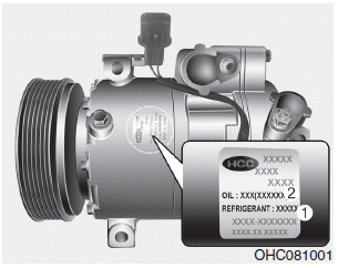 Этикетка компрессора информирует вас о типе компрессора, которым оснащен ваш автомобиль. с такими данными, как модель, номер детали поставщика, заводской номер, хладагент (1) и охлаждающее масло (2).