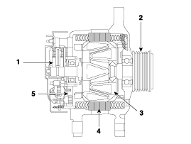 2. OAP (обгонная муфта генератора) 3. Ротор 4. Статор 5. Выпрямитель |
