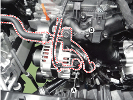 Освободите кронштейн шланга охлаждающей жидкости (В) после ослабления крепежного болта.