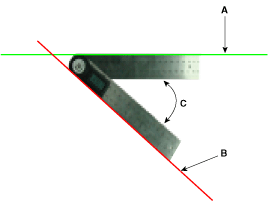 Измерьте угол (C) между центральной линией (A) измерительного уголка.