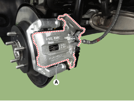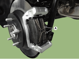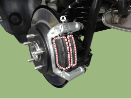 Поднимите корпус суппорта (А), ослабив болт направляющей штанги.