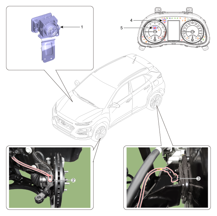 2. Датчик скорости переднего колеса 3. Датчик скорости заднего колеса |