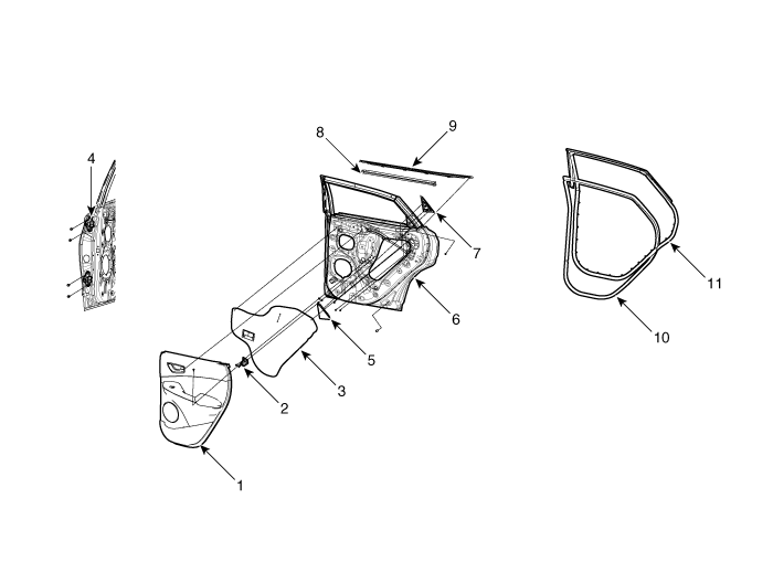 8. Ремень задней двери внутри уплотнителя 9. Ремень задней двери снаружи уплотнителя 10. Боковой уплотнитель кузова задней двери 11. Боковой уплотнитель задней двери |
