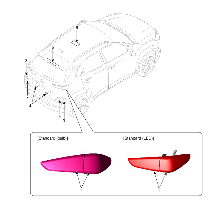 2. Фонарь заднего хода (левый) / Задний противотуманный фонарь (правый) 3. Лампа указателя поворота 4. Лампа лицензии |